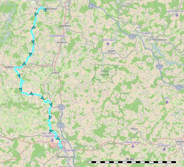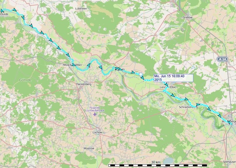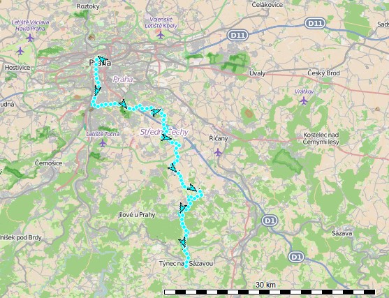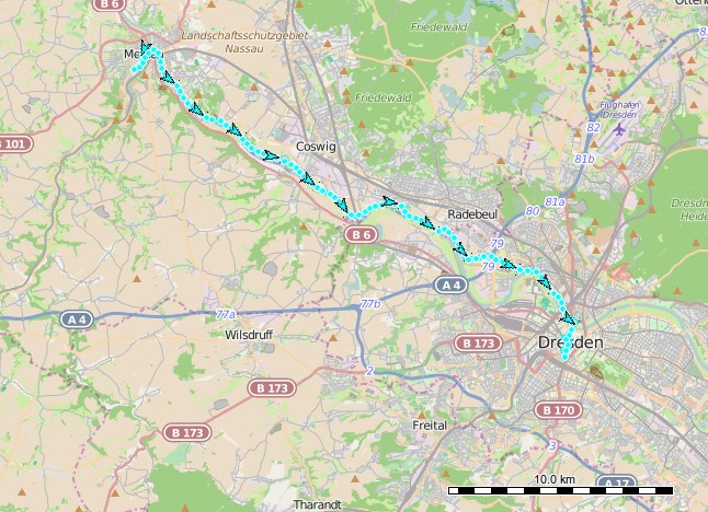 Strecke: Start in Hamburg, immer der Elbe entlang über Magdeburg, Dresden nach Tschechien. Ab Melnik entlang der Moldau bis Prag, Weiter über Tabor, Nova Bystrice, der österr. tschechischen Grenze entlang bis Laa/Thaya, Mistelbach, Wien.